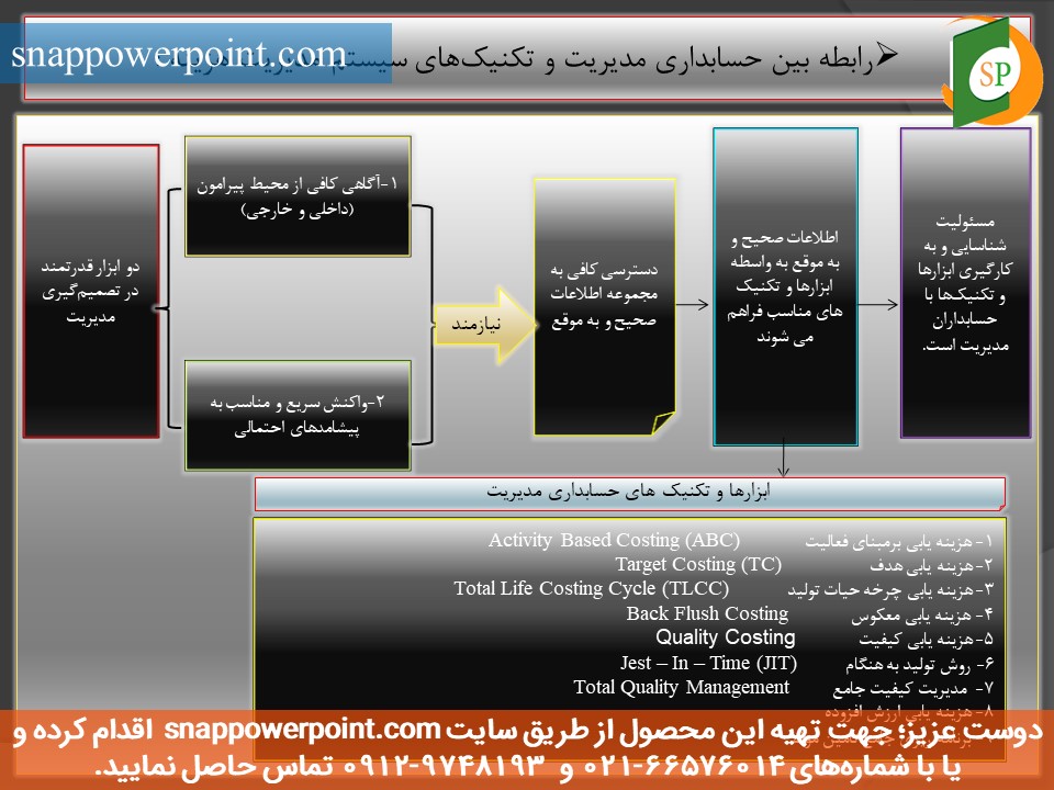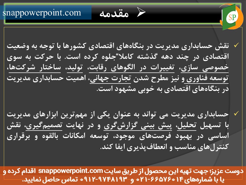 یقینا”؛ تعداد بیشمار دیگری پاورپوینت آماده در مورد مباحث حسابداری مدیریت در شرکت دانش بنیان اسنپ پاورپوینت، وجود دارد که دوستان عزیز با یک سرچ ساده در سایت اسنپ پاورپوینت، میتوانند به آنها دسترسی داشته و پس ار تهیه از آنها در راستای افزایش توان علمی خود، استفاده نمایند.