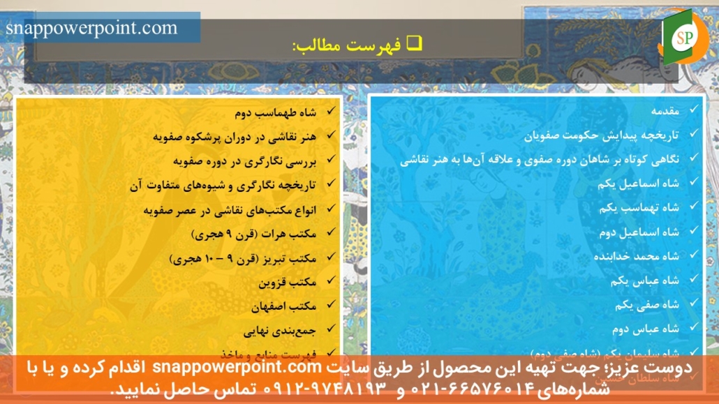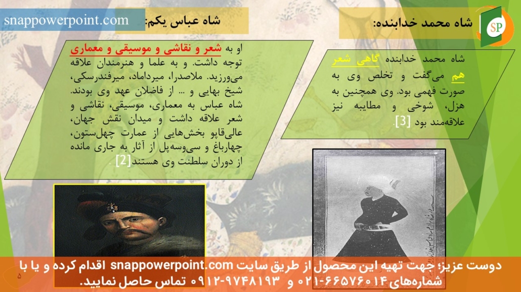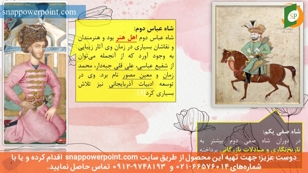 | *** *** *** | عنوان محصول: پاورپوینت آماده نقش شاهان دوره صفوی بر رشد نقاشی نکته مهم: |