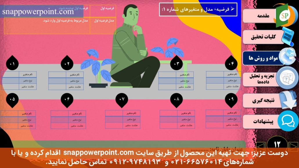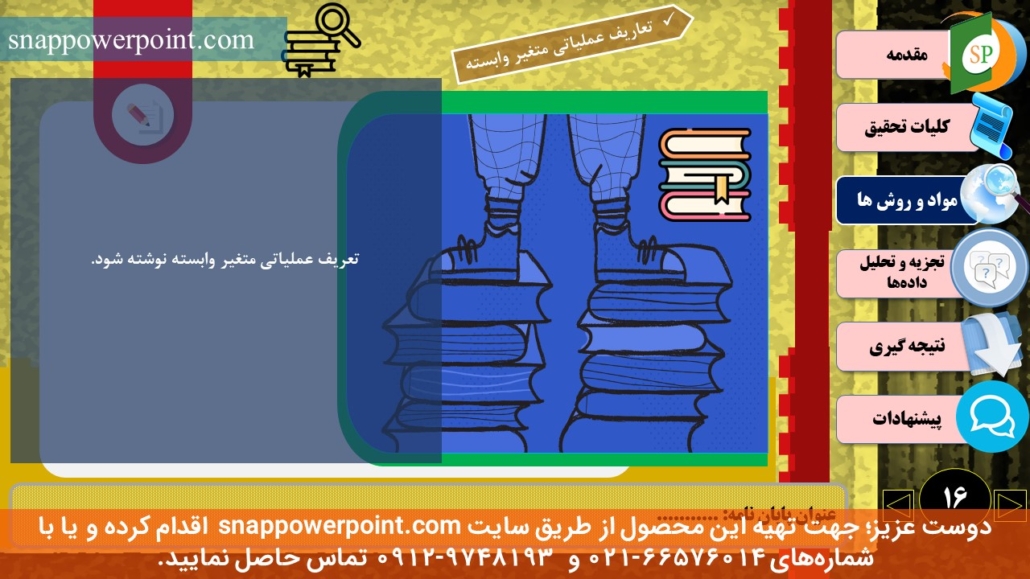 در بین مدیران شرکتها، مدیران مالی بیشترین و سنگینترین و در عین حال جذابترین نوع مدیریت را، بر عهده دارند. مباحث مالی؛ به عنوان بنیادیترین عنصر یک شرکت و یا سازمان محسوب شده و بدون وجود نقدینگی و توانایی مالی کافی، عملاﹰ ادامه عمر آن شرکت و یا سازمان، میسر نخواهد شد. مدیران مالی؛ جزء آن دسته از مدیرانی هستند که، اگر خودشون هم همت کافی به خرج دهند، روز به روز دانش مدیریتی آنها، افزایش پیدا خواهد کرد. میتوان چنین بیان کرد که؛ عوامل تاثیرگذار بر صورتهای مالی شرکتها، تقریبا نامحدود هستند و مدیران مالی شرکتها، باید هر روز بر دانش خود در زمینههای مختلف این عوامل تاثیرگذار افزایش داده، تا قبل از شروع یک بحران مالی، تصمیمات و برنامهریزیهای لازم، در جهت رفع آن را انجام داده باشند. بنابراین یک مدیر مالی، باید وسعت دید فراوانی داشته و بر مبنای تفکرات بنیادی خود، راهحلهای مختلفی را در جهت بهبود وضعیت نقدینگی یک شرکت، ارئه نماید. تفکرات بنیادی یک مدیر مالی، زمانی شکل عملی به خود خواهد گرفت که او، از قبل خصوصاﹰ از زمان طولانی و فرصت طلایی دانشجویی استفاده کرده و بر روی خلاقیت ذهن خود کار کرده باشد. دوران طلایی دانشجویی زمانی هستش که؛ یک دانشجوی محصل در رشته مدیریت مالی، میتواند با ابزارهای به ظاهر بسیار ساده، درجه خلاقیت ذهن خود را به شکلی باور نکردنی، افزایش دهد. یکی از این ابزارهای به ظاهر ساده؛ که بر روی خلاقیت ذهن انسان بسیار بسیار بسیار تاثیرگذار است، نرمافزار پاورپوینت میباشد. خب شاید تا قبل از رسیدن به زمان دفاع از پایان نامه در مقطع کارشناسی ارشد، یک دانشجوی مدیریت مالی، با این نرمافزار عملاﹰ کاری نداشته باشد، اما در این مقطع به طور اساسی، نیاز به آن را احساس خواهد کرد. تهیه یک قالب پاورپوینت فوق حرفهای میتواند؛ به عنوان نقطه شروع استفاده یک دانشجوی عزیز رشته مدیریت مالی، از این نرمافزار بینظیر، در جهت پرورش خلاقیت ذهن خود باشد. پایان نامه؛ به عنوان شالوده اساسی سالها تحصیلات آکادمیک یک دانشجو محسوب شده و دفاع مناسب و عالی از آن، از طریق به نمایش گذاشتن، توسط یک قالب پاورپوینت فوقالعاده، امکانپذیر خواهد بود. قالب پاورپوینت آماده پایاننامه مدیریت مالی – طرح شهاب، یک قالب بسیار زیبا و بینظیر هستش که؛ به صورت کاملاﹰ فوق حرفهای، توسط اعضای نخبه و قدرتمند گروه تخصصی اسنپ پاورپوینت، طراحی شده است. این قالب فوقحرفهای دارای بخشهای دلنشین زیر میباشد: